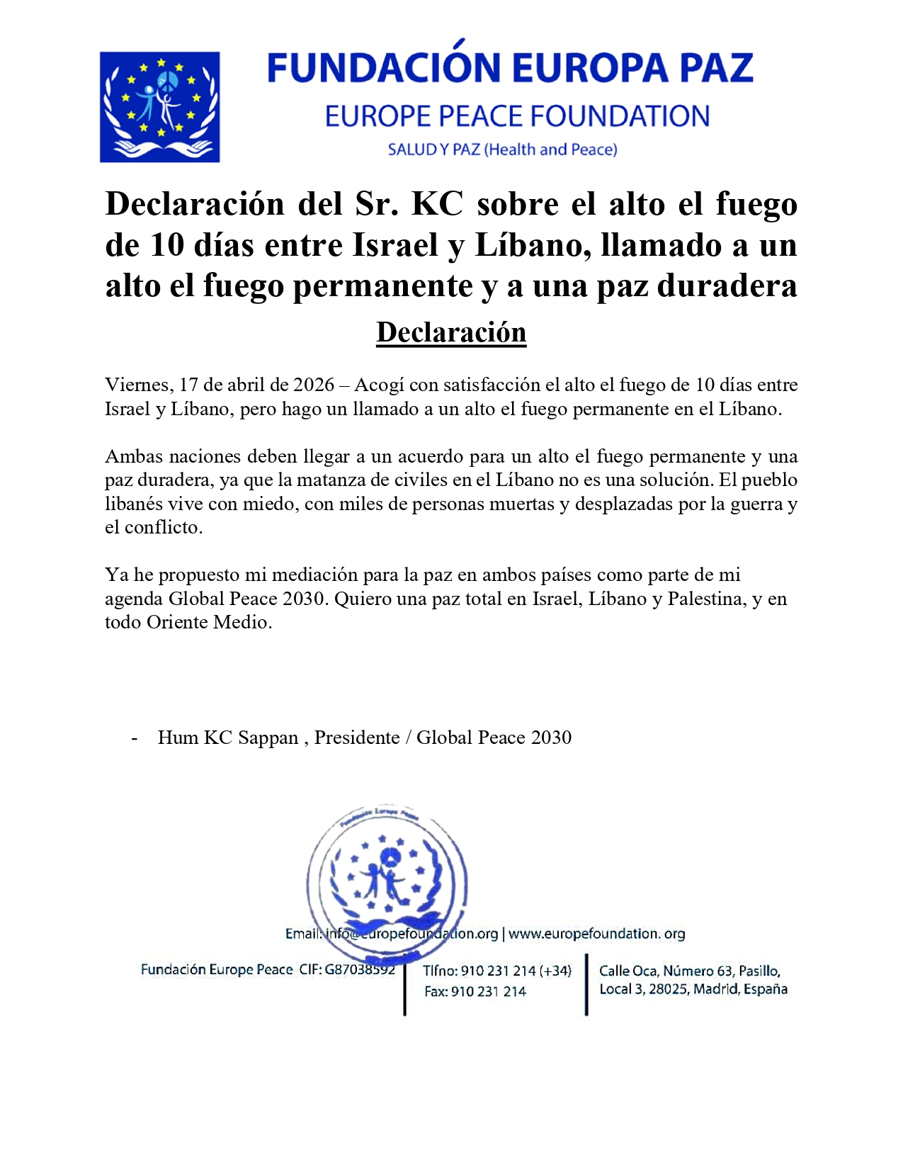 Viernes, 17 de abril de 2026 – Acogí con satisfacción el alto el fuego de 10 días entre Israel y Líbano, pero hago un llamado a un alto el fuego permanente en el Líbano.