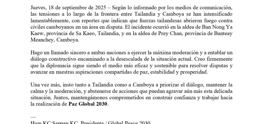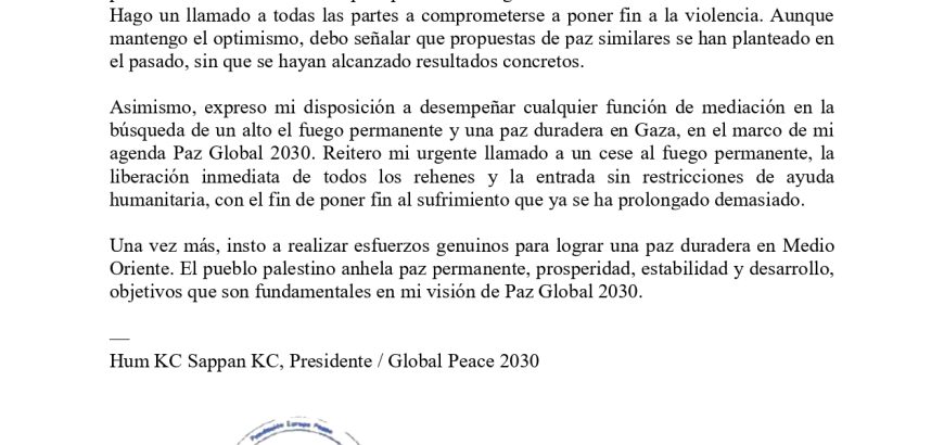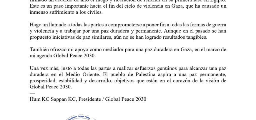 Declaraciones del Presidente Sr. KC sobre el Alto el Fuego en Gaza y la Liberación de Rehenes Jueves, 9 de octubre de 2025 – Doy la bienvenida a la noticia de que Israel y Hamás han firmado un acuerdo de alto el fuego y liberación de rehenes en su primera