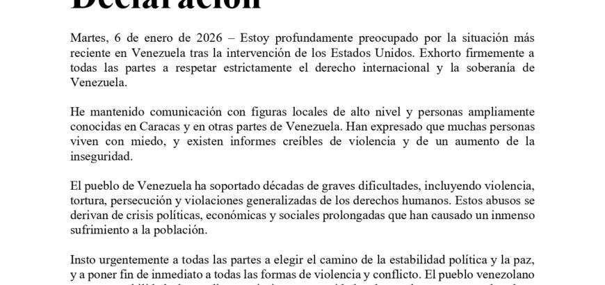 Declaración del Sr. KC sobre la Situación en Venezuela Declaración Martes, 6 de enero de 2026 – Estoy profundamente preocupado por la situación más reciente en Venezuela tras la intervención de los Estados Unidos. Exhorto firmemente a todas las partes a respetar estrictamente el derecho internacional y la soberanía de