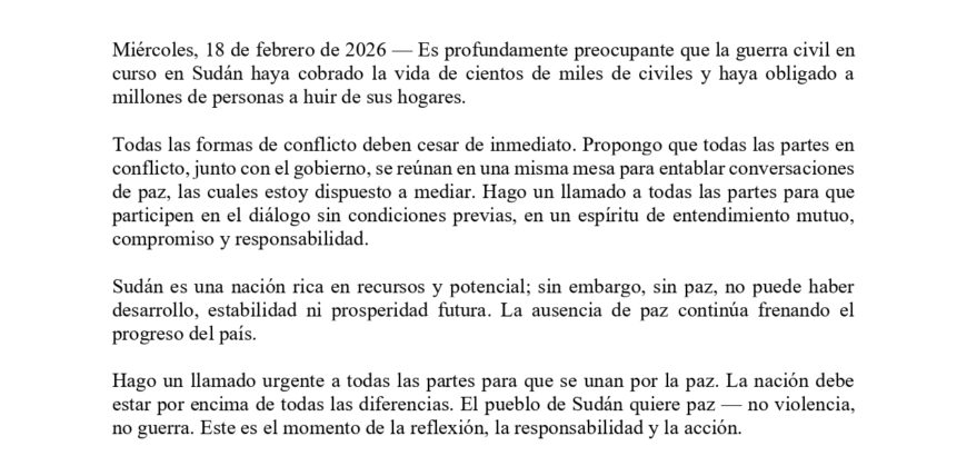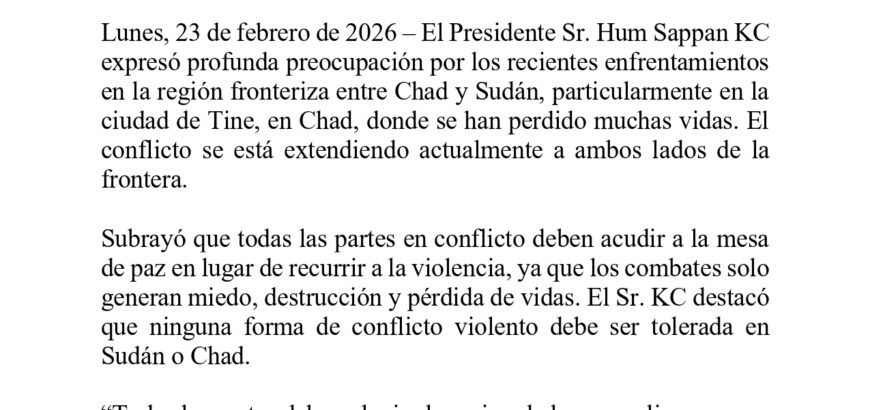 El Sr. KC Expresa Preocupación por la Violencia en la Frontera Chad–Sudán y Pide Conversaciones de Paz Lunes, 23 de febrero de 2026 – El Presidente Sr. Hum Sappan KC expresó profunda preocupación por los recientes enfrentamientos en la región fronteriza entre Chad y Sudán, particularmente en la ciudad de