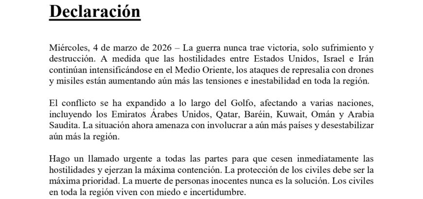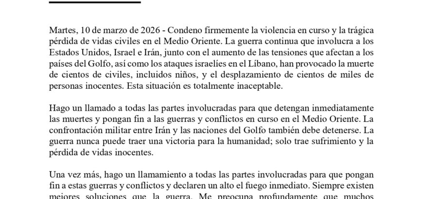 Declaración del Sr. KC sobre las muertes de civiles y la crisis humanitaria en el Líbano y los conflictos en el Medio Oriente Declaración Martes, 10 de marzo de 2026 - Condeno firmemente la violencia en curso y la trágica pérdida de vidas civiles en el Medio Oriente. La guerra