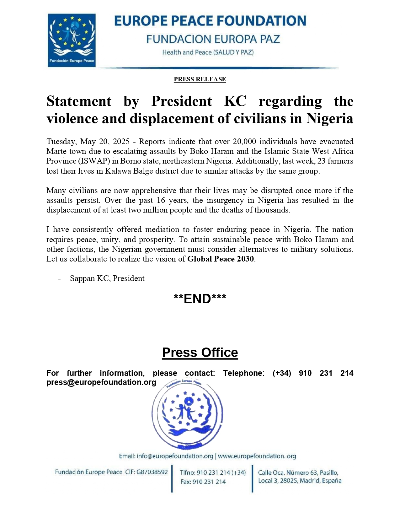 Statement by President KC regarding the violence and displacement of civilians in Nigeria