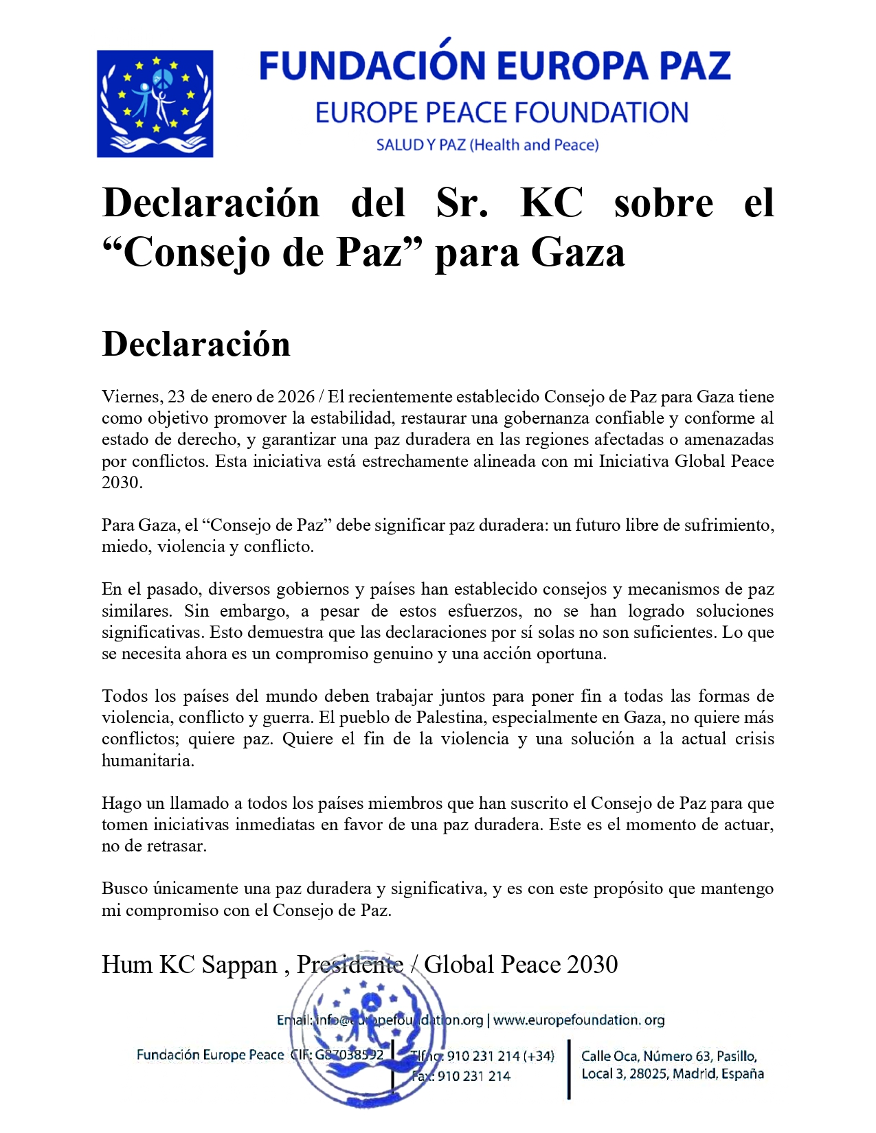 Viernes, 23 de enero de 2026 / El recientemente establecido Consejo de Paz para Gaza tiene como objetivo promover la estabilidad, restaurar una gobernanza confiable y conforme al estado de derecho, y garantizar una paz duradera en las regiones afectadas o amenazadas por conflictos. Esta iniciativa está estrechamente alineada con mi Iniciativa Global Peace 2030.