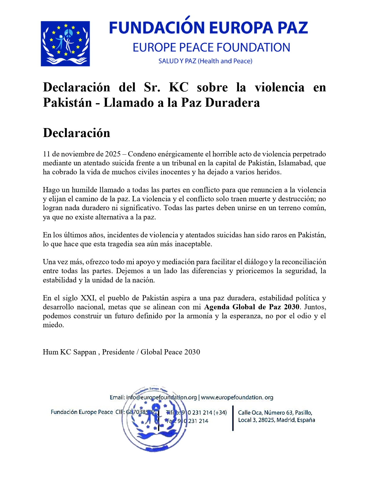 11 de noviembre de 2025 – Condeno enérgicamente el horrible acto de violencia perpetrado mediante un atentado suicida frente a un tribunal en la capital de Pakistán, Islamabad, que ha cobrado la vida de muchos civiles inocentes y ha dejado a varios heridos.