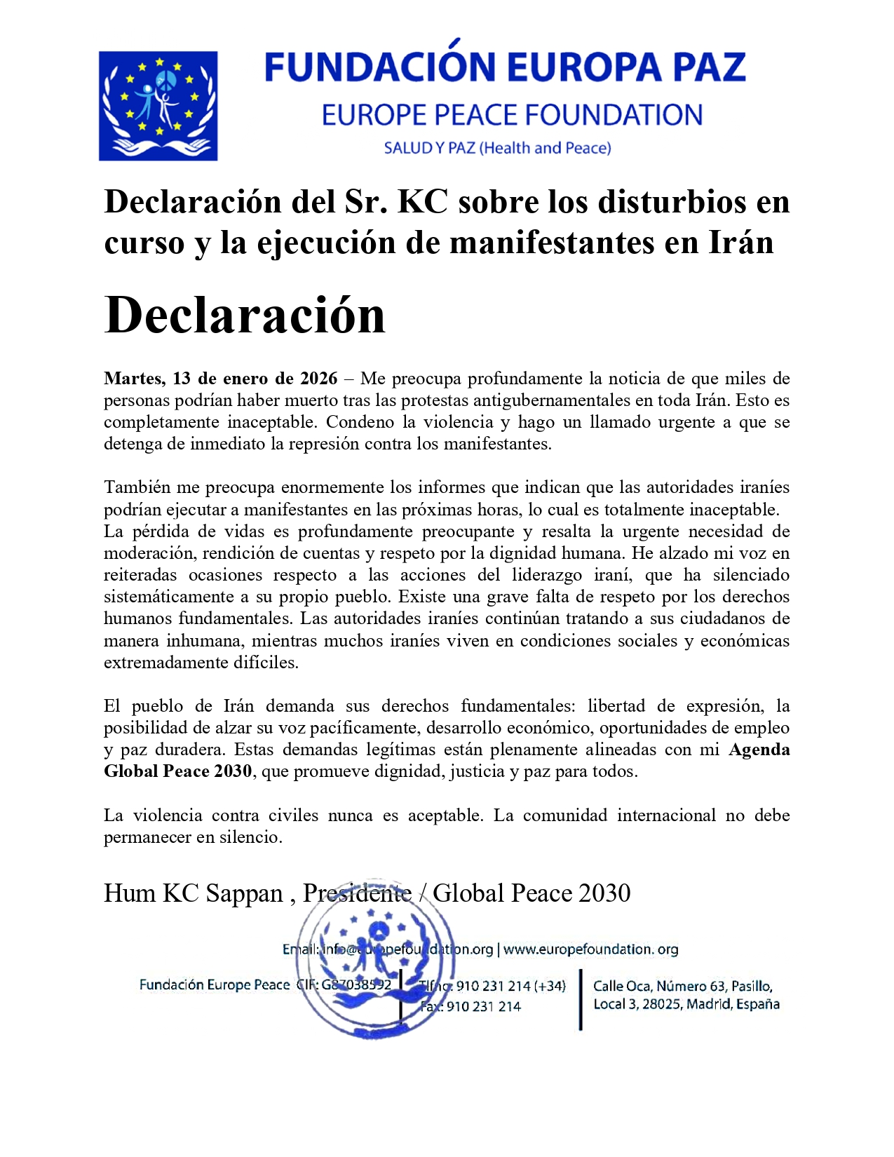 El pueblo de Irán demanda sus derechos fundamentales: libertad de expresión, la posibilidad de alzar su voz pacíficamente, desarrollo económico, oportunidades de empleo y paz duradera. Estas demandas legítimas están plenamente alineadas con mi Agenda Global Peace 2030, que promueve dignidad, justicia y paz para todos.