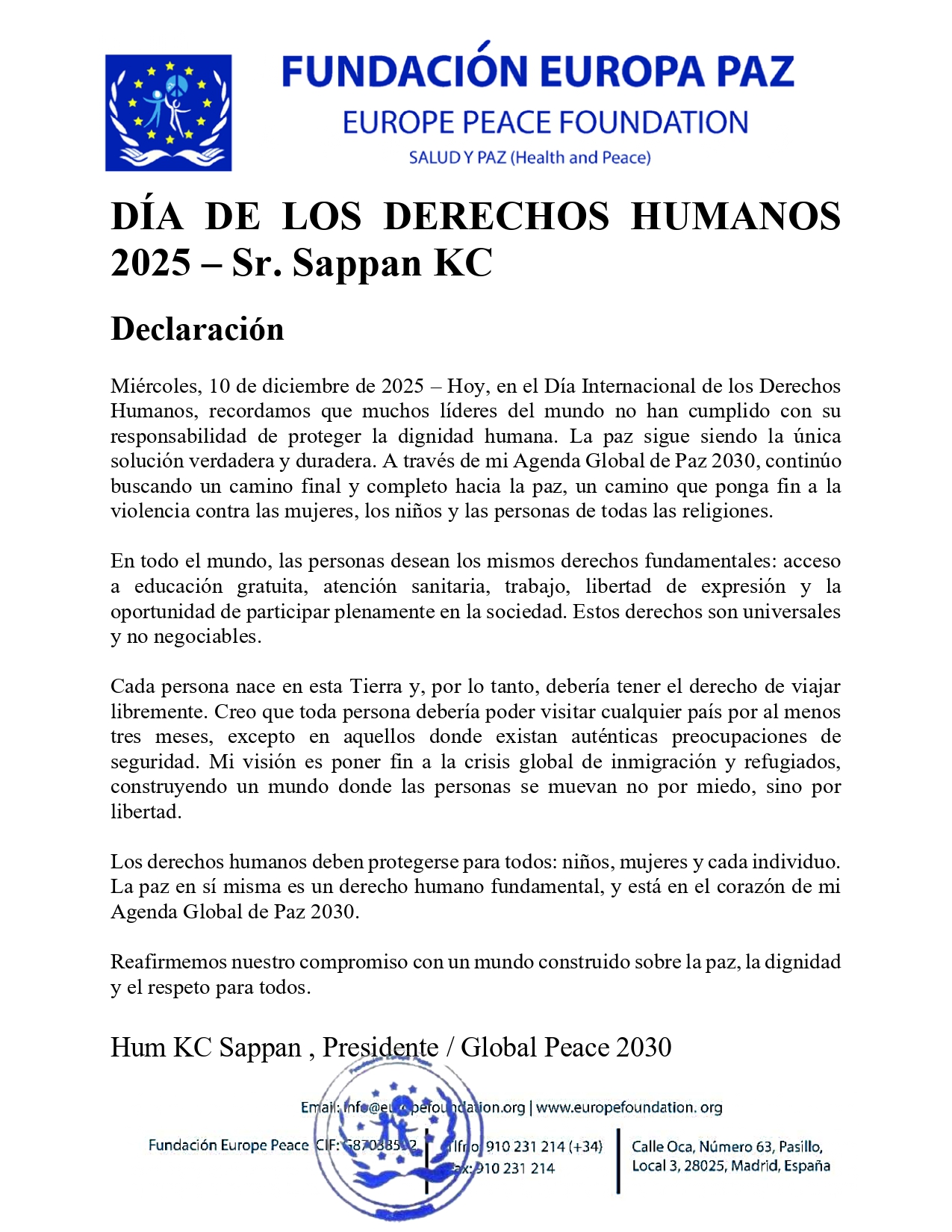 Miércoles, 10 de diciembre de 2025 – Hoy, en el Día Internacional de los Derechos Humanos, recordamos que muchos líderes del mundo no han cumplido con su responsabilidad de proteger la dignidad humana. La paz sigue siendo la única solución verdadera y duradera. A través de mi Agenda Global de Paz 2030, continúo buscando un camino final y completo hacia la paz, un camino que ponga fin a la violencia contra las mujeres, los niños y las personas de todas las religiones.