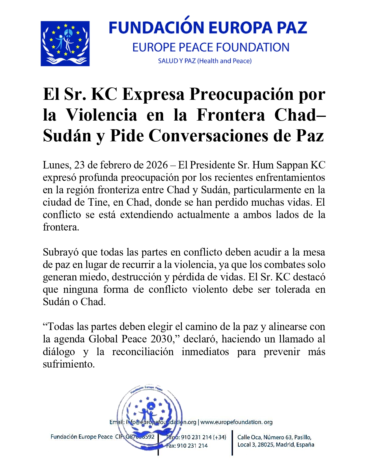 Lunes, 23 de febrero de 2026 – El Presidente Sr. Hum Sappan KC expresó profunda preocupación por los recientes enfrentamientos en la región fronteriza entre Chad y Sudán, particularmente en la ciudad de Tine, en Chad, donde se han perdido muchas vidas. El conflicto se está extendiendo actualmente a ambos lados de la frontera.
