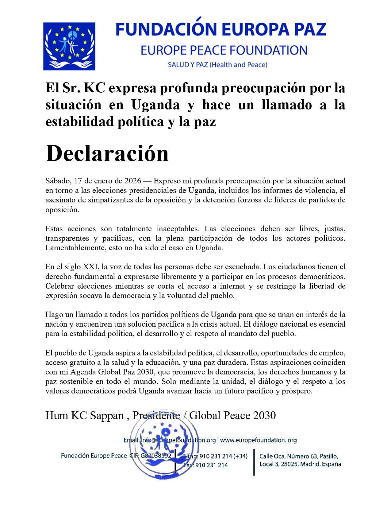 El pueblo de Uganda aspira a la estabilidad política, el desarrollo, oportunidades de empleo, acceso gratuito a la salud y la educación, y una paz duradera. Estas aspiraciones coinciden con mi Agenda Global Paz 2030, que promueve la democracia, los derechos humanos y la paz sostenible en todo el mundo. Solo mediante la unidad, el diálogo y el respeto a los valores democráticos podrá Uganda avanzar hacia un futuro pacífico y próspero.
