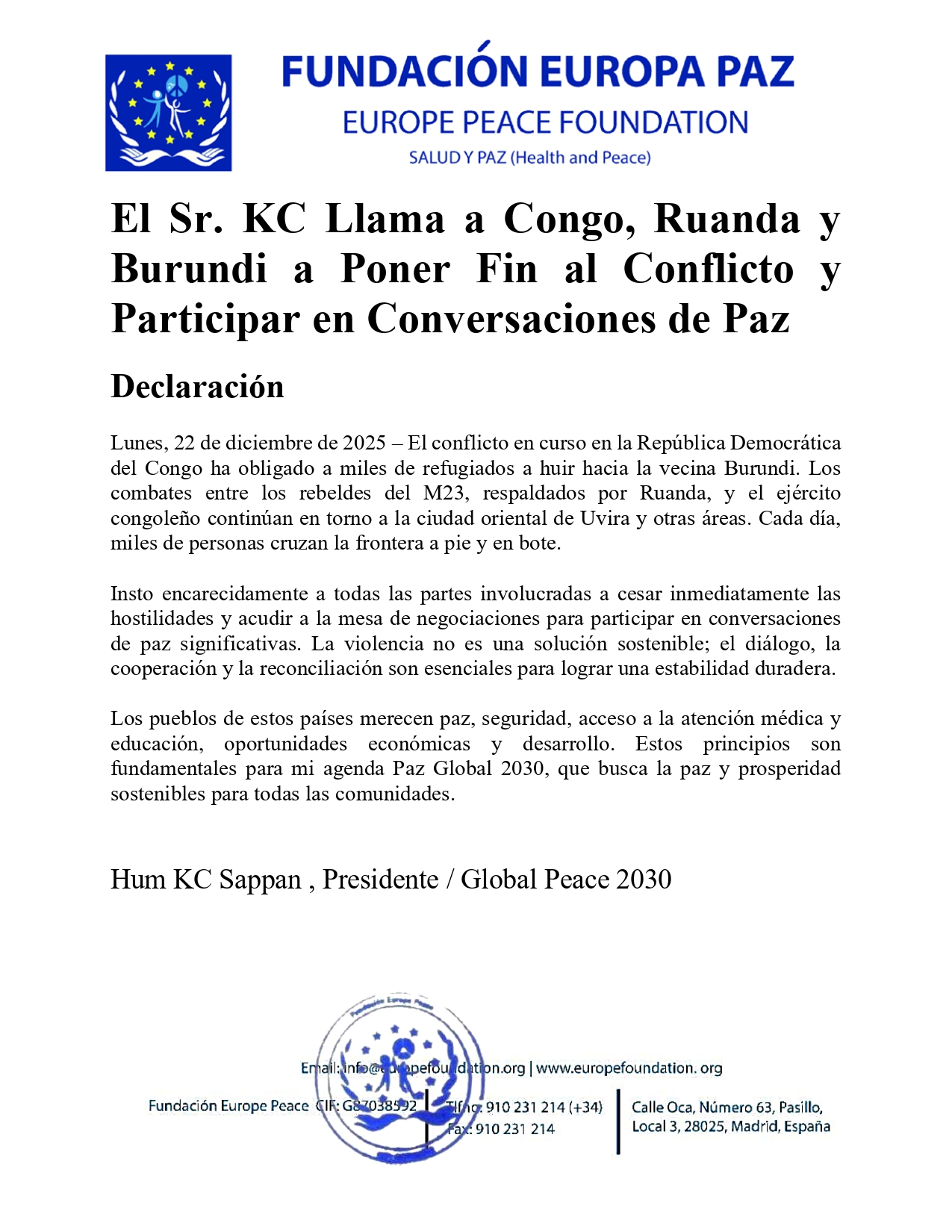 El Sr. KC Llama a Congo, Ruanda y Burundi a Poner Fin al Conflicto y Participar en Conversaciones de Paz