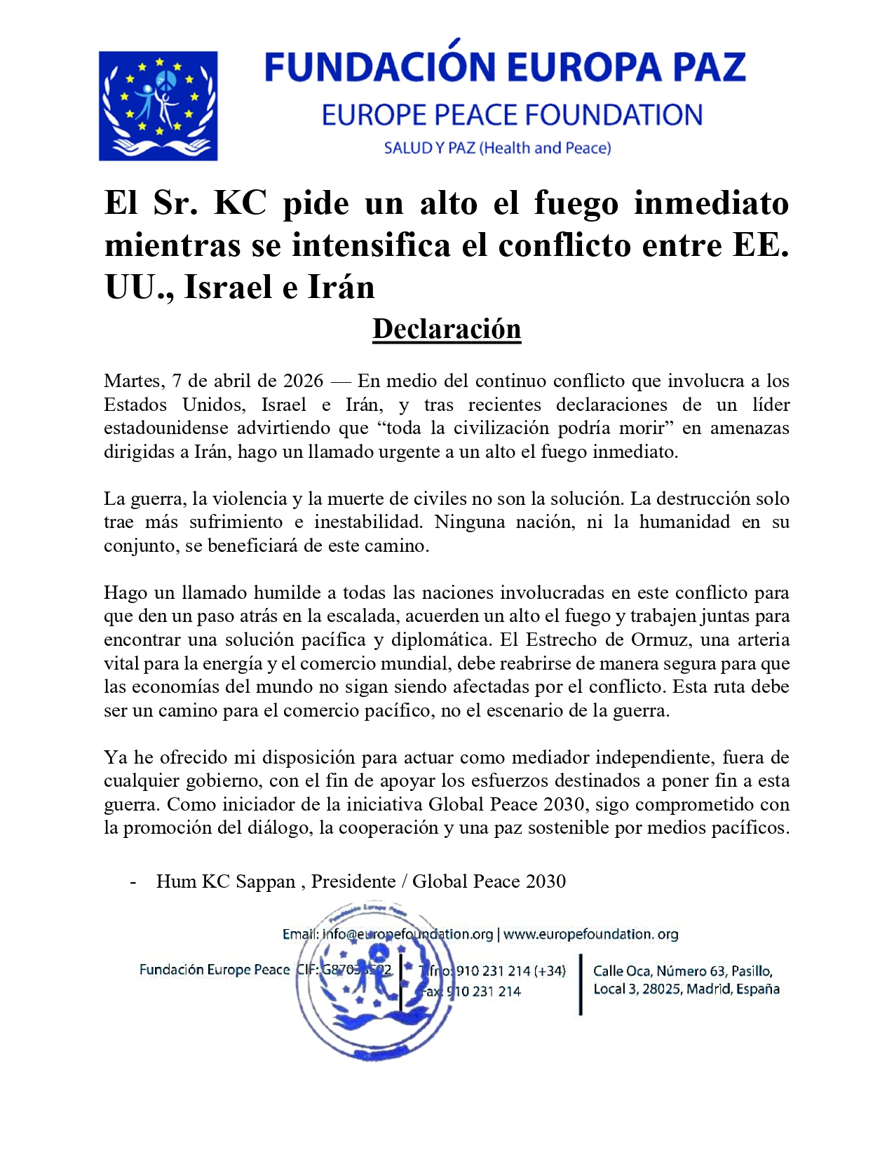 Ya he ofrecido mi disposición para actuar como mediador independiente, fuera de cualquier gobierno, con el fin de apoyar los esfuerzos destinados a poner fin a esta guerra. Como iniciador de la iniciativa Global Peace 2030, sigo comprometido con la promoción del diálogo, la cooperación y una paz sostenible por medios pacíficos.