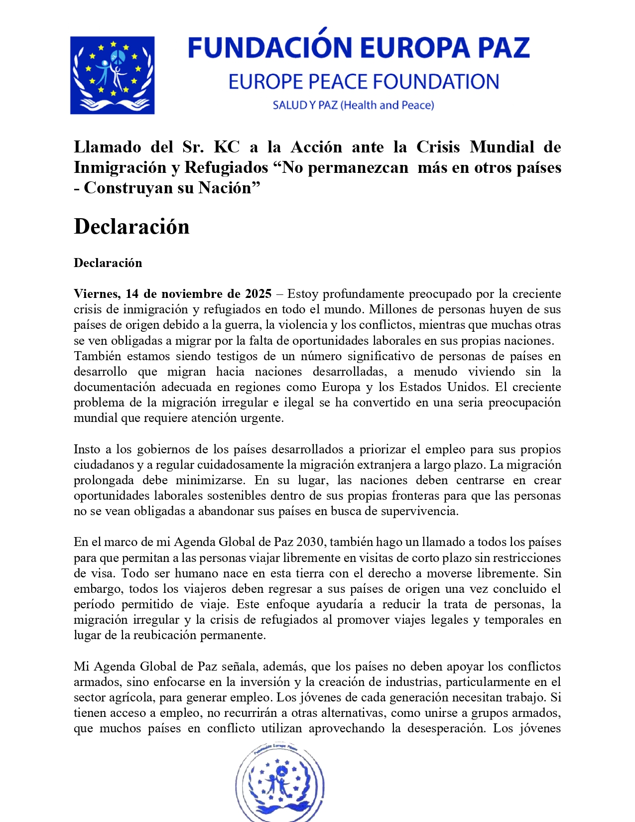 En el marco de mi Agenda Global de Paz 2030, también hago un llamado a todos los países para que permitan a las personas viajar libremente en visitas de corto plazo sin restricciones de visa. Todo ser humano nace en esta tierra con el derecho a moverse libremente. Sin embargo, todos los viajeros deben regresar a sus países de origen una vez concluido el período permitido de viaje. Este enfoque ayudaría a reducir la trata de personas, la migración irregular y la crisis de refugiados al promover viajes legales y temporales en lugar de la reubicación permanente.