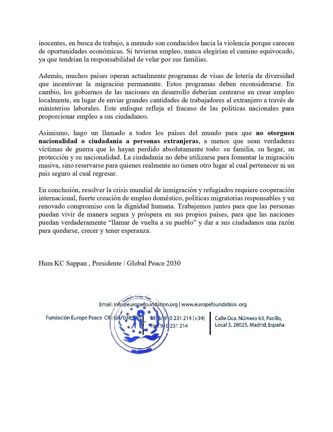 En conclusión, resolver la crisis mundial de inmigración y refugiados requiere cooperación internacional, fuerte creación de empleo doméstico, políticas migratorias responsables y un renovado compromiso con la dignidad humana. Trabajemos juntos para que las personas puedan vivir de manera segura y próspera en sus propios países, para que las naciones puedan verdaderamente “llamar de vuelta a su pueblo” y dar a sus ciudadanos una razón para quedarse, crecer y tener esperanza.