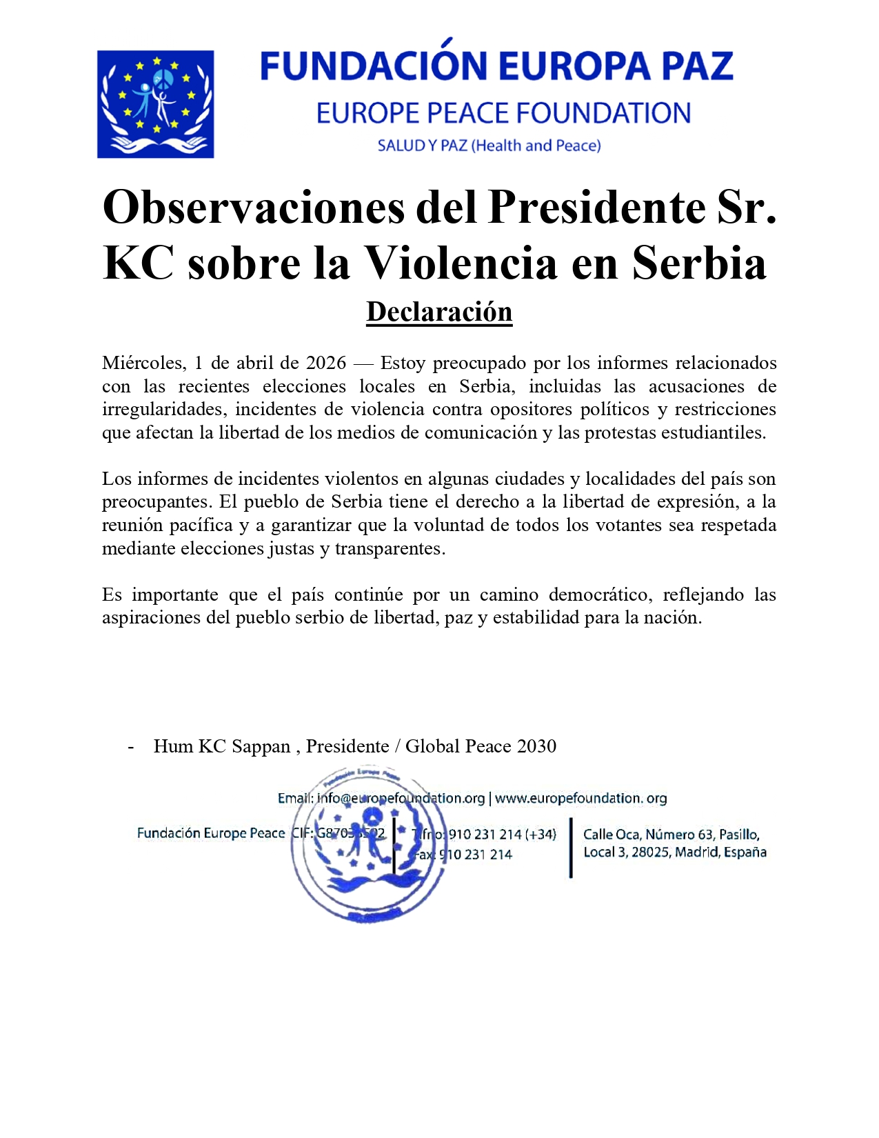 Observaciones del Presidente Sr. KC sobre la Violencia en Serbia