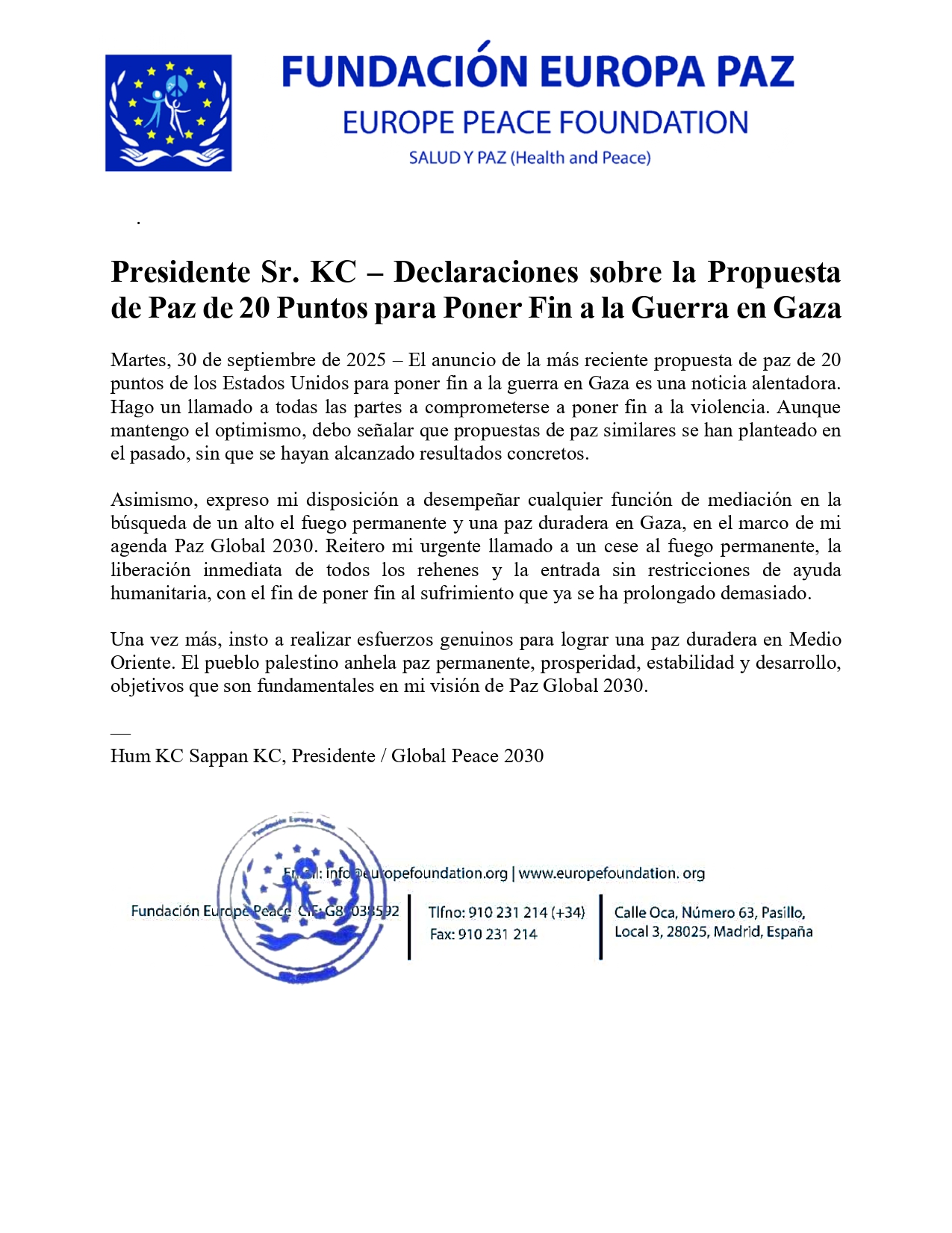 Presidente Sr. KC – Declaraciones sobre la Propuesta de Paz de 20 Puntos para Poner Fin a la Guerra en Gaza